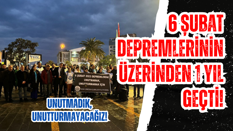 KESK Dönem Sözcüsü ve TÜM BEL-SEN Şube Başkanı Hakan Sarıyıldız tarafından okunan bildiride, “Takvimler bugün 6 Şubatı, bir yıl önce hepimizi yasa boğan bir acıyı gösteriyor. Ne yazık ki yaşadığımız bu coğrafyanın tarihi her zaman acıların, yıkımların, felaketlerin tarihi oldu. Bu topraklarda yaşayan insanlar olarak çok acı gördük. Çokça çile çektik.