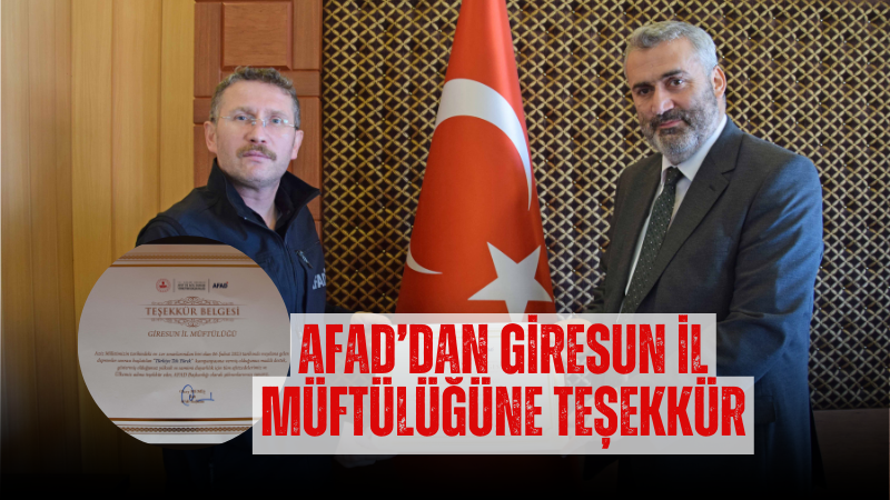 AFAD, Kahramanmaraş merkezli 11 ili etkileyen depremler için başlatılan “Türkiye Tek Yürek” yardım kampanyasına destek veren Giresun İl Müftülüğüne “Teşekkür Belgesi” gönderdi.