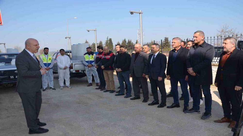 İlçe Tarım ve Orman müdürlüğü bahçesinde " kahverengi kokarca kışlık mücadelesi" ilaçlama çalışmaları kapsamında verilen start öncesi İlçe Tarım ve Orman Müdürü Mehmet Güreş, "Bugün kahverengi kokarca ile ilgili kışlık mücadelesi için havaların 13-14 santigrat sınmasıyla beraber kahverengi kokarcaların dışarı çıkmasını takip edecek şekilde ilaçlama ekiplerimizle birlikte startını veriyoruz. 110 mahallemizde 3 ekiple Mart ayının sonuna kadar ilaçlamayı tamamlamış bulunacağız" dedi.