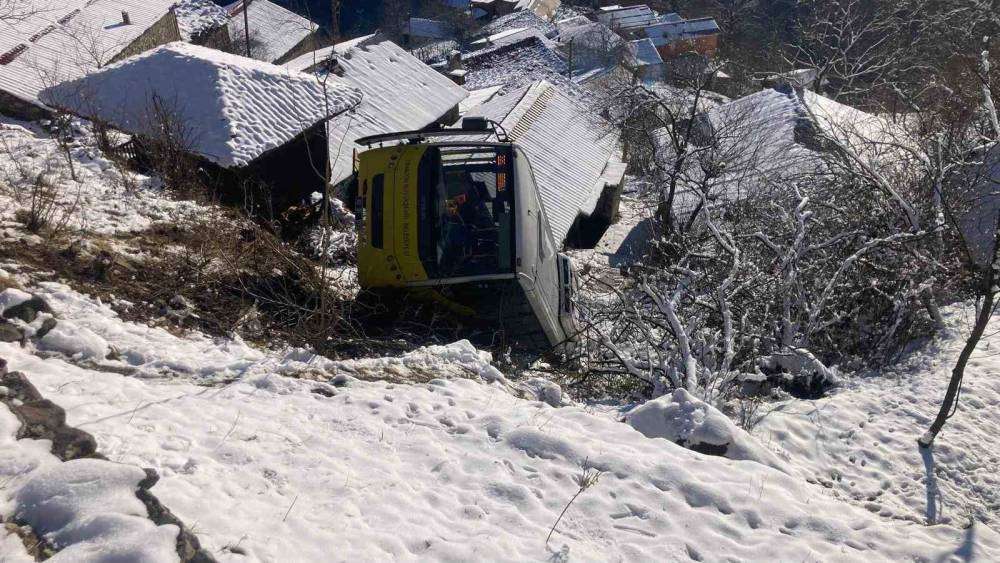 Belediye yolcu otobüsü karlı ve buzlu yolda kontrol çıkarak yamaçtan aşağıya yuvarlandı