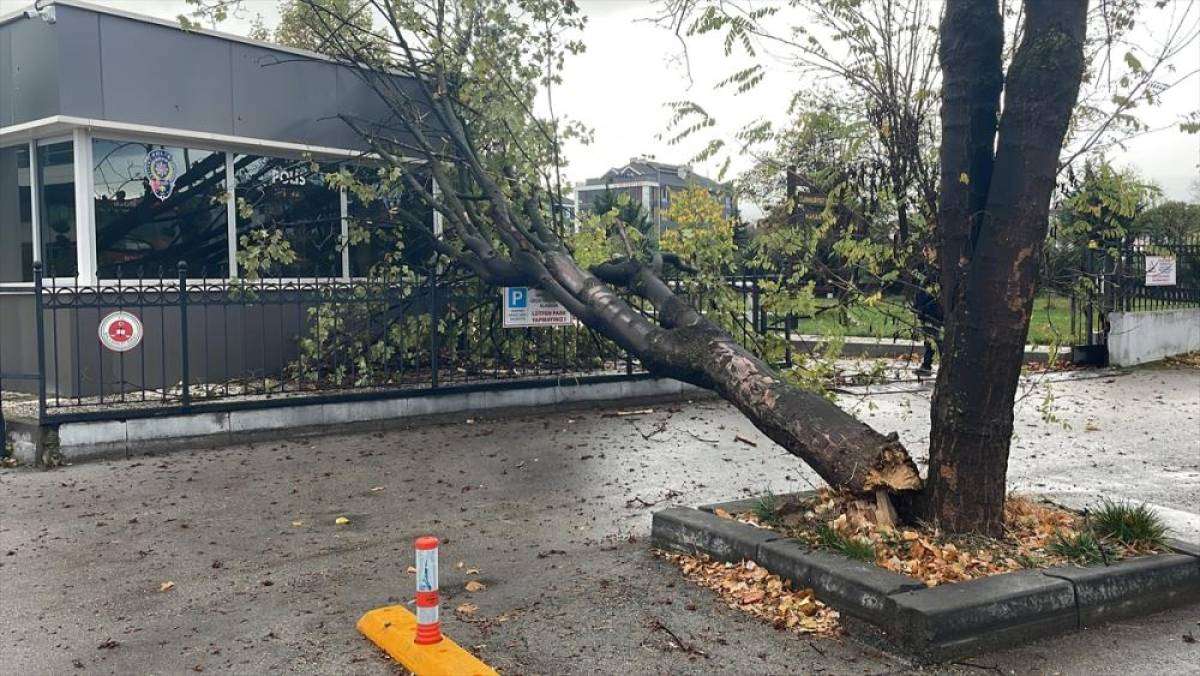 Bolu'da rüzgarda devrilen ağaç polis noktasının üzerine düştü