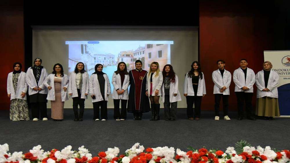 Öğrencilerin mezuniyet törenlerinde de aynı sevinci ve heyecanı paylaşacaklarını söyleyen Doç. Dr. Özdelikara, öğrencilere seslenerek, “Bugün burada aslında meslek hayatınız boyunca sürecek bir hareket noktasında bulunuyorsunuz. Sağlıkta yaşam hakkını ve insan onuruna saygıyı konuştuğumuz bu günlerde sizden en büyük beklentimiz doğruluk ve dürüstlükten ayrılmamanızdır. Birazdan burada giyeceğiniz beyaz önlük sadece sağlık ve esenliğin değil aynı zamanda mesleki ahlakın, insan onuruna yakışır yaşam sürmenin ve dürüstlüğünde temsili niteliğindedir" diye konuştu.