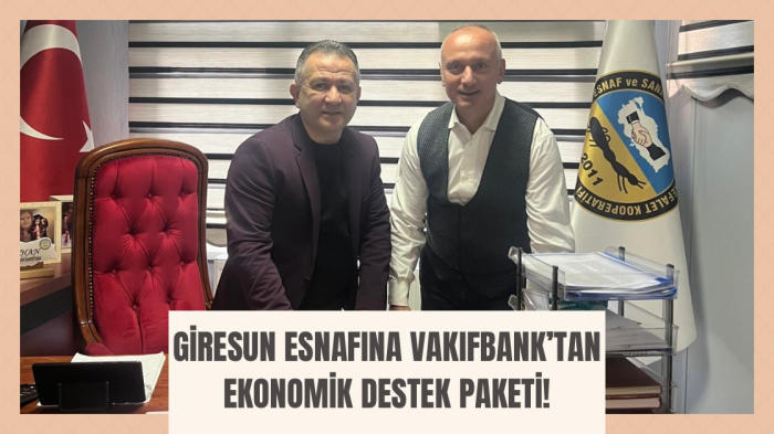 Vakıfbank iş birliğiyle hayata geçirildi. Vakıfbank Giresun Şubesi Müdürü Hakan Aydın ve GESOB Başkanvekili Ercan Ayhan arasında imzalanan protokol kapsamında, esnaflara %2.99 faiz oranıyla bir yıl geri ödemesiz, 60 aya kadar vadeli 500 bin TL’ye kadar “Tam Destek Paketi” kredisi sunulacak.