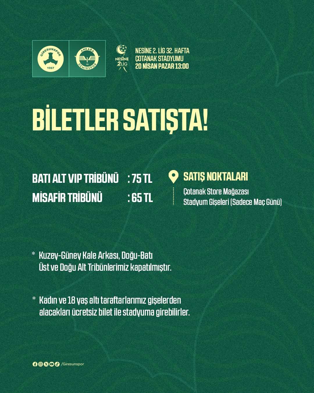 Nesine 2. Lig’in 32. haftasında Giresunspor’un, Ankara Demirspor ile oynayacağı karşılaşmanın biletleri satışa sunuldu.
