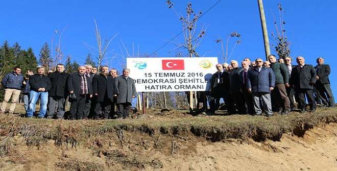 Dereli Kümbet Karayolu üzerinde Cımbırtlık Mevkiinde 15 Temmuz Şehitleri için hatıra ormanı açılışı yapıldı. Hatıra Ormanının açılışında konuşan Orman Bölge Müdürü Veysel Kodalak; "15 Temmuz Şehitlerimizin aziz hatıralarına saygı olarak ilimizi temsilen burada oluşturduğumuz 250 adet ıhlamur ve 50 adet dut fidanından oluşan yaklaşık 5 dekarlık alandaki bu ağaçların meyvelerinden, yöre halkımız ve bu yoldan geçen vatandaşlarımız istifade ettikçe, aziz şehitlerimizin ruhu şad olacaktır" dedi.'HAYIRLI BİR İŞ YAPIYORUZ' Bu hatıra ormanını yaparak, hayırlı bir iş yapıldığını ifade eden Vali Karahan, "15 Temmuz da hiç kimsenin hayal bile etmeyeceği, arzu bile etmeyeceği bir menfur hadise yaşandı. 15 Temmuz gecesi yaşanan bu menfur olay, milletimizin sokakları, caddeleri, meydanları, havaalanlarını Sayın Cumhurbaşkanımızın talimatıyla anında sel misali doldurması, tepkisini göstermesi ve gövdesini o hainlerin silahlarına karşı siper etmesiyle def edildi. İnşallah bir daha böyle bir hadise yaşamayız. Bugünde bir hatıra ormanı yapıyoruz ve gerçekten hayırlı bir iş yapıyoruz. Çünkü bizim inancımıza göre kıyamet kopuyor olsa bile elimizdeki fidanı dikmekle sorumluyuz, yükümlüyüz" diye konuştu.
