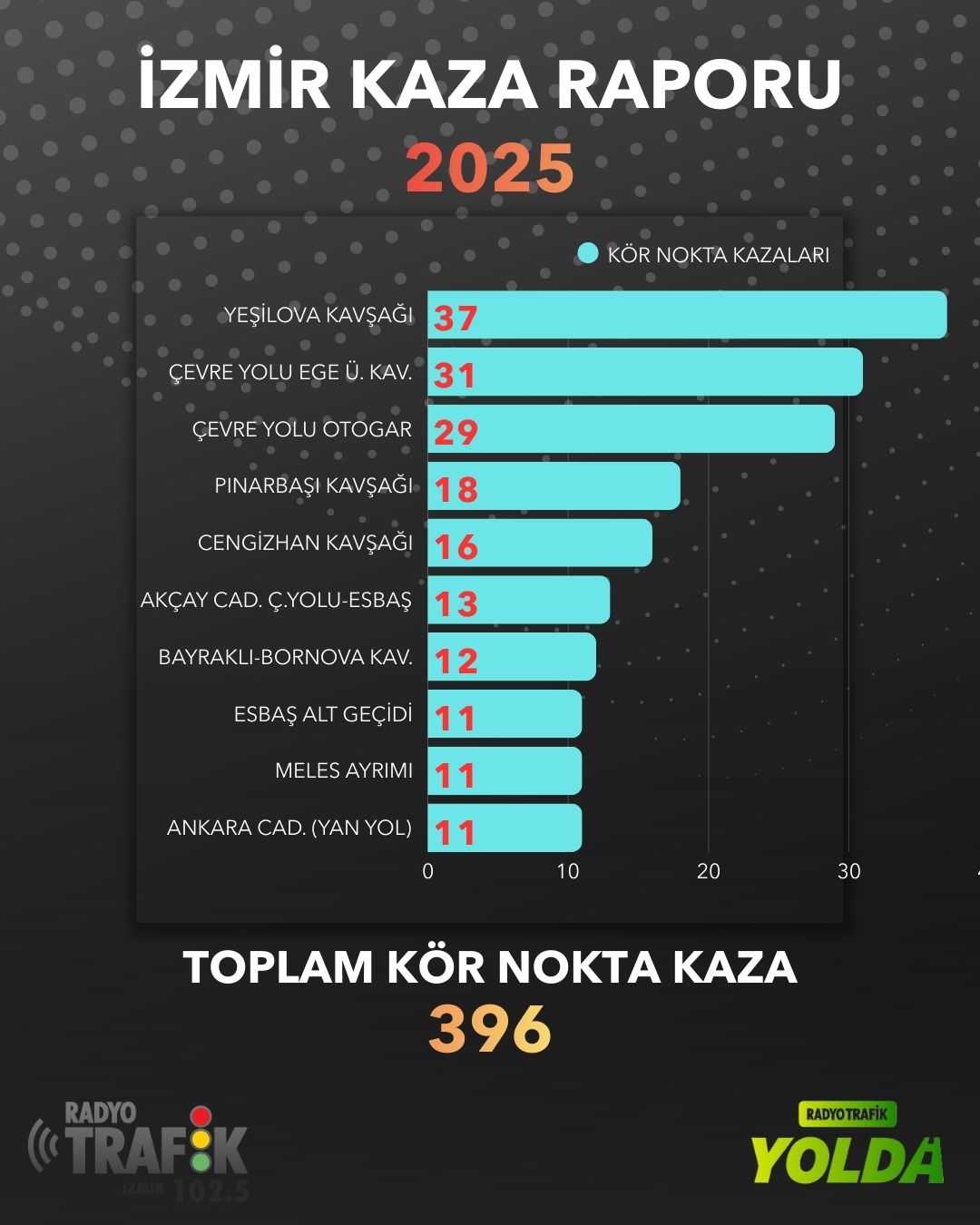 Büyük araçların kör noktalarına dikkat etmeyen sürücüler, geçtiğimiz yıl İzmir’de 396 trafik kazasının yaşanmasına neden oldu. Bu kazaların büyük kısmı çevre yollarındaki katılım noktalarında meydana geldi. Radyo Trafik İzmir’e ulaşan belgeli (fotoğraf, video) verilere göre Yeşilova, Otogar ve Pınarbaşı katılımları en çok kör nokta kazasının yaşandığı bölgelerdi. Çevre Yolları dışında Akçay Caddesi kör nokta kazalarında dikkati çekti. Çevre Yolu Köprüsü altı ile ESBAŞ Alt Geçidi arası (alt geçit dahil) toplam 24 kör nokta kazasının yaşandığı bölge oldu.