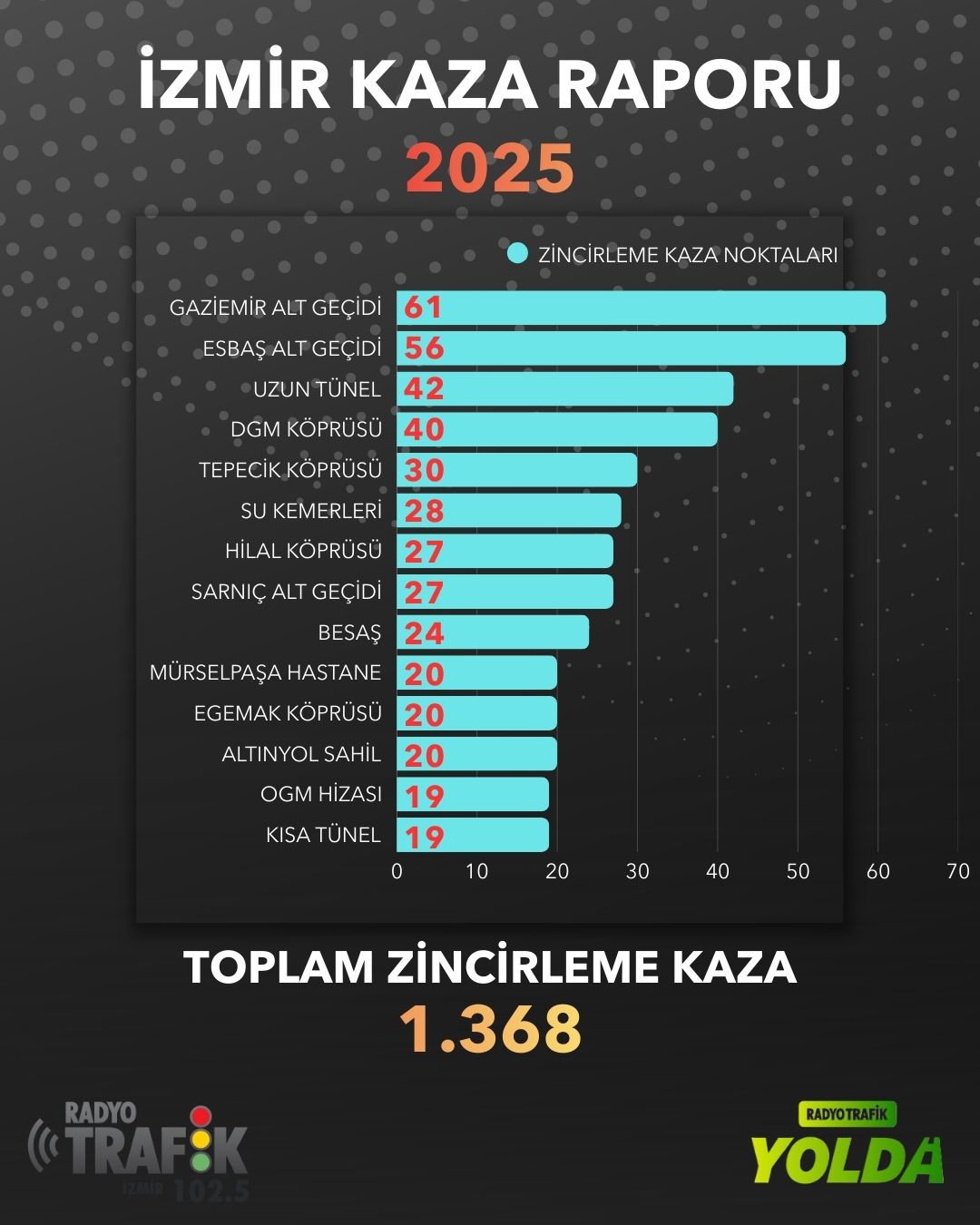 Radyo Trafik İzmir haber merkezine 2025 yılında ulaşan bin 368 zincirleme kazada alt geçitler, köprüler ve tüneller ilk sıralarda yer altı. Gaziemir Alt Geçidi ve Çevre Yolu Bayraklı Tünellerinde 61’er zincirleme trafik kazası meydana geldi. Bayraklı Tünellerindeki kazalardan 42’si uzun, 19’u kısa tünelde oldu.Akçay Caddesi en çok zincirleme kazaya sahne olan arter olurken, Gaziemir Alt Geçidi’nin ardından 56 zincirleme kazayla ESBAŞ Alt Geçidi 2. sırada yer aldı.