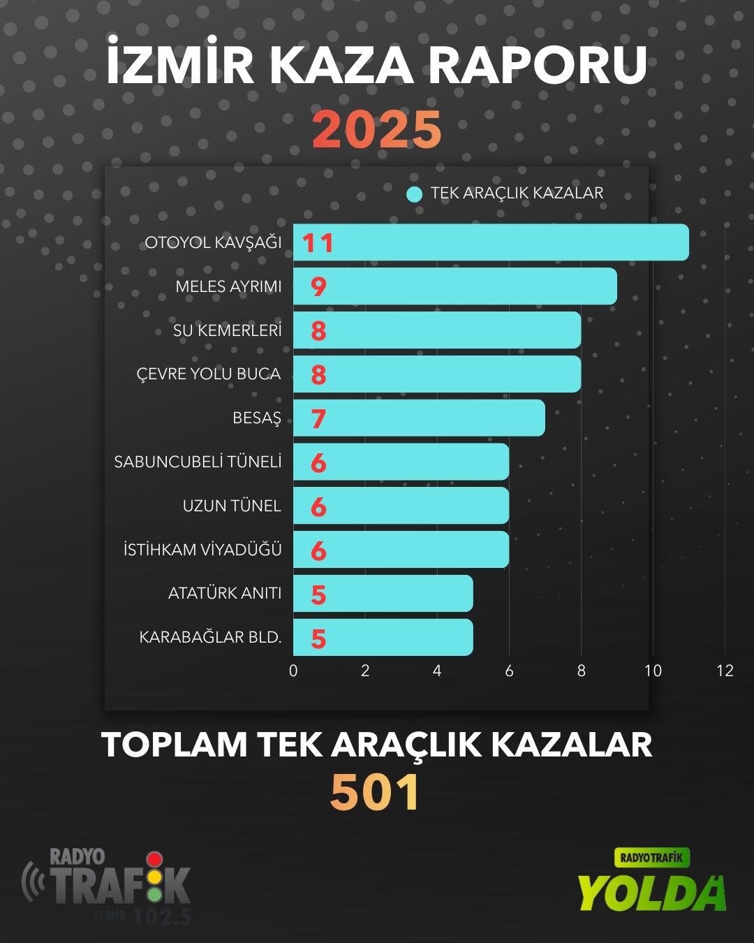 Yağışlı havalarda, ıslak zeminde sıklıkla rastlanan tek araçlık kazalar 2025 yılında da can aldı. 501 tek araçlık kazaların dağılımı farklılık gösterdi. Çevre Yolu Otoyol Kavşağı’nda 11, Altınyol Meles hizasında 9, Tarihi Su Kemerleri Bölgesi ve Çevre Yolu Buca Doğu/Batı kavşakları arasında 8’er kaza tek araçlık kazalar olarak raporlandı.