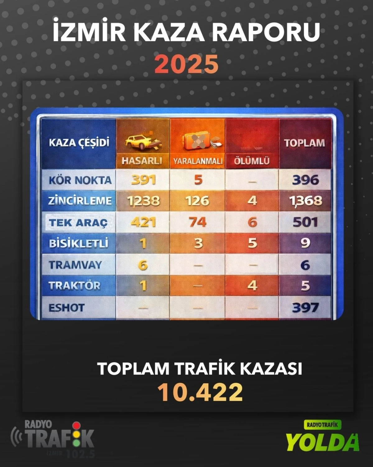 Yıllardır İzmir trafiğinin nabzını tutan Radyo Trafik İzmir, istatistiksel verilerle kaza raporlarını da yayınlamaya devam ediyor. Buna göre; 2025 yılı içinde meydana gelen kazalara dair çarpıcı veriler ortaya çıktı.