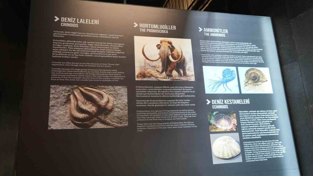 Müzede ayrıca, dinozorların ortaya çıkmasından 220 milyon yıl önce denizlerde yaşayan deniz kestaneleri, 65 milyon yıl önce yok olan ammonitler ve çiçeğe benzeyen deniz laleleri hakkında da bilgilendirmeler yer alıyor.