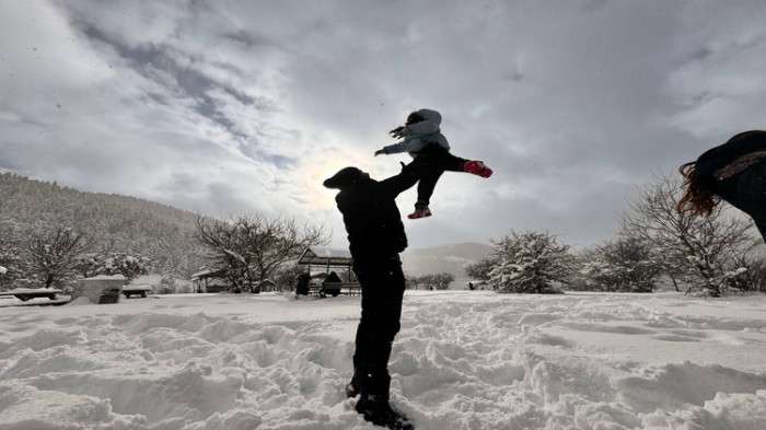 Bölgede etkisini sürdüren yağışın ardından kar kalınlığının yaklaşık 50 santimetreye ulaştığı parka gelen tatilciler, göl çevresinde yürüyüş yapıp, kartpostallık görüntüler eşliğinde hatıra fotoğrafı çekiliyor.
