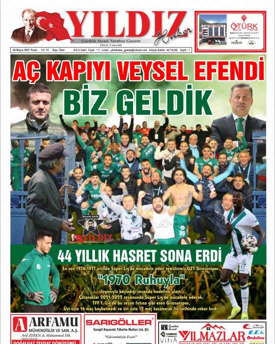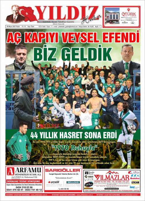 TFF 1. Lig'de son hafta maçında Tuzlaspor'u deplasmanda 2-1 yenen temsilcimiz Giresunspor, Adana Demirspor'la birlikte Süper Lig'e yükselen ikinci takım oldu. Çotanaklar 44 yıl sonra Süper Lig'e geri döndü.