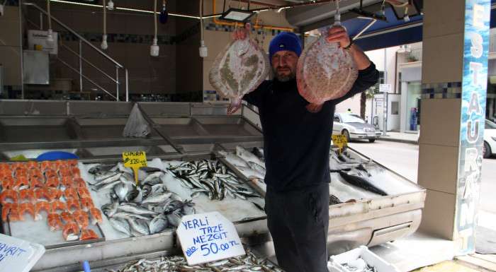 Geçmiş yıllara oranla bu sezon daha fazla ağlara takılan kalkan balıkları tezgahlarda kilogramı 500 liradan satışa sunuldu.