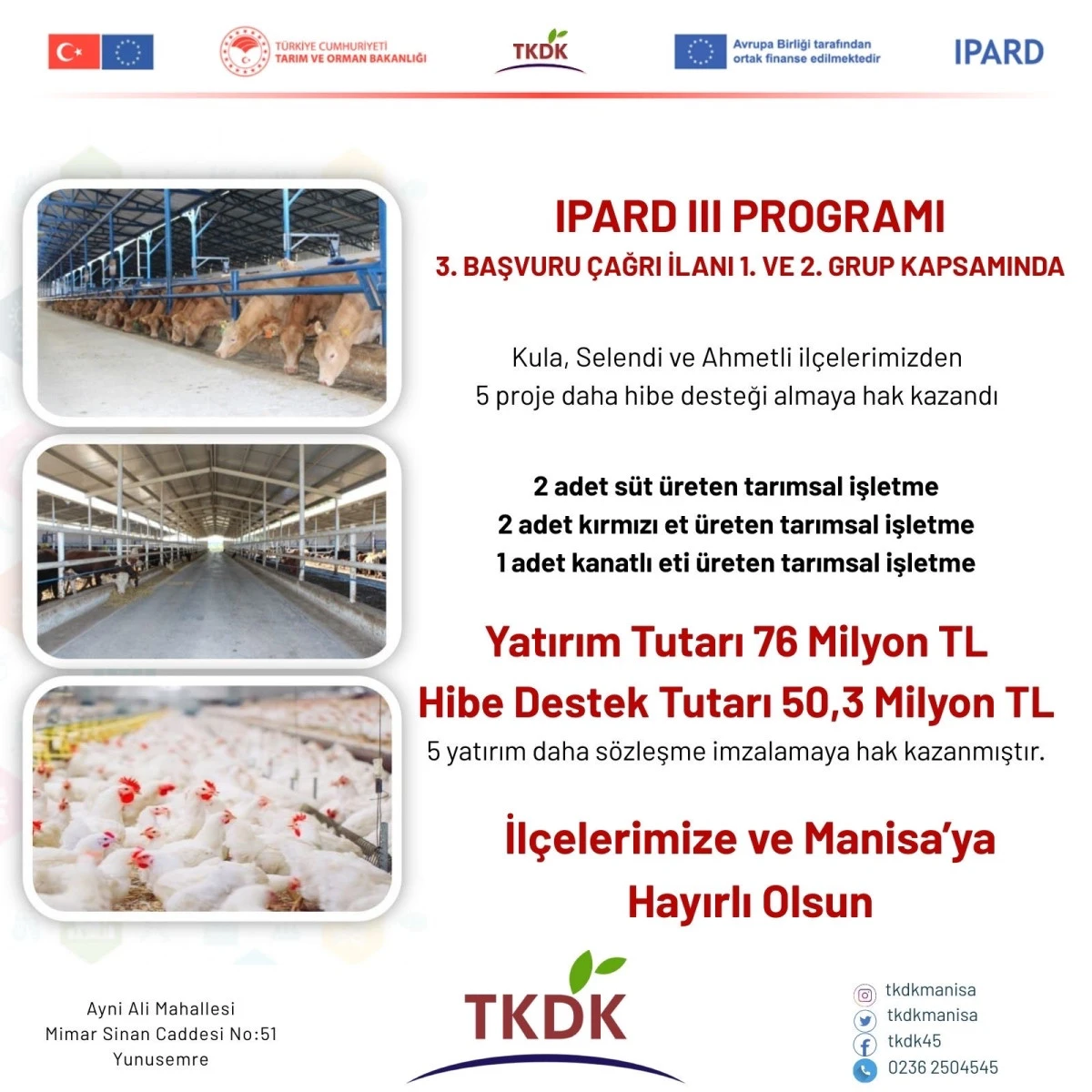 Tarım ve Kırsal Kalkınmayı Destekleme Kurumu’nun (TKDK) IPARD III Programı Üçüncü Başvuru Çağrı İlanı kapsamında yapılan değerlendirmeler sonucunda, Manisa’dan başvuru yapan 5 yeni projenin daha hibe almaya hak kazandığı açıklandı.