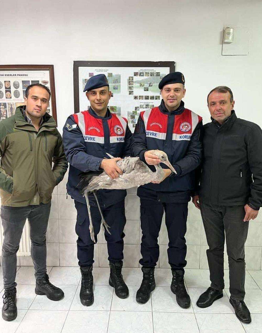İl Jandarma Komutanlığı Çevre, Doğa ve Hayvan Koruma Tim Komutanlığı ekipleri, Şerefiye köyünde yapılan kontrollerde yol kenarında kanadından yaralı ve bitkin halde turna kuşu buldu.