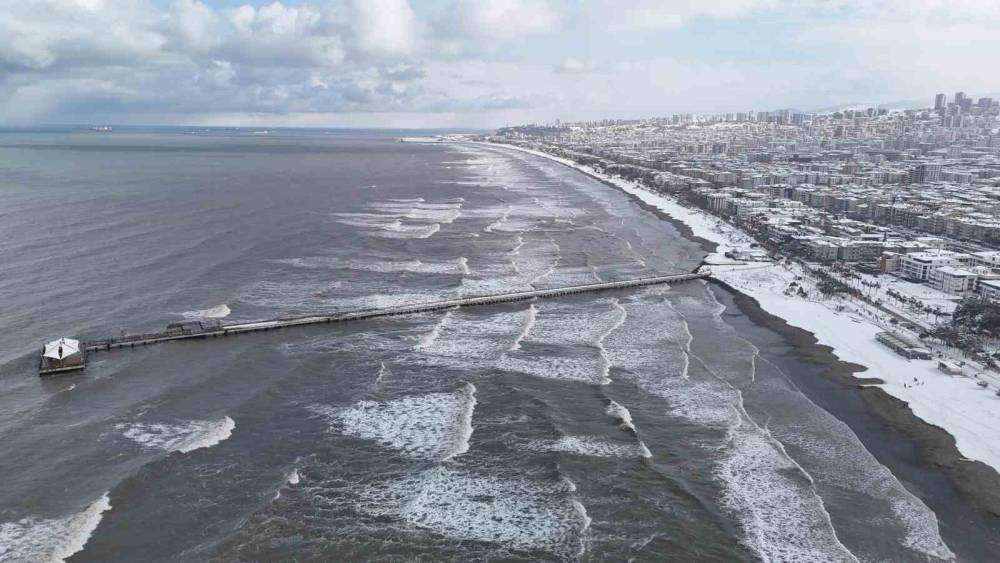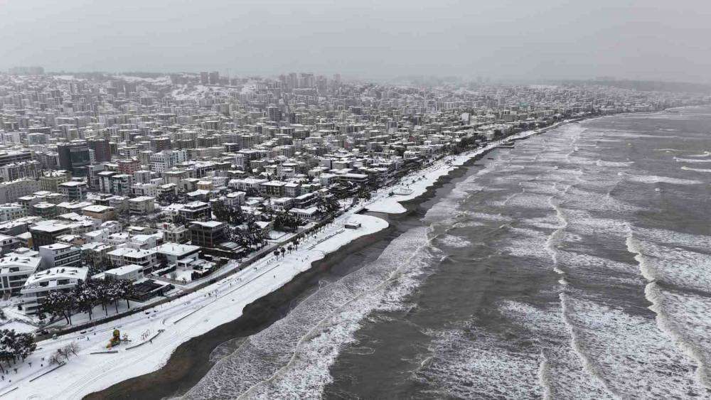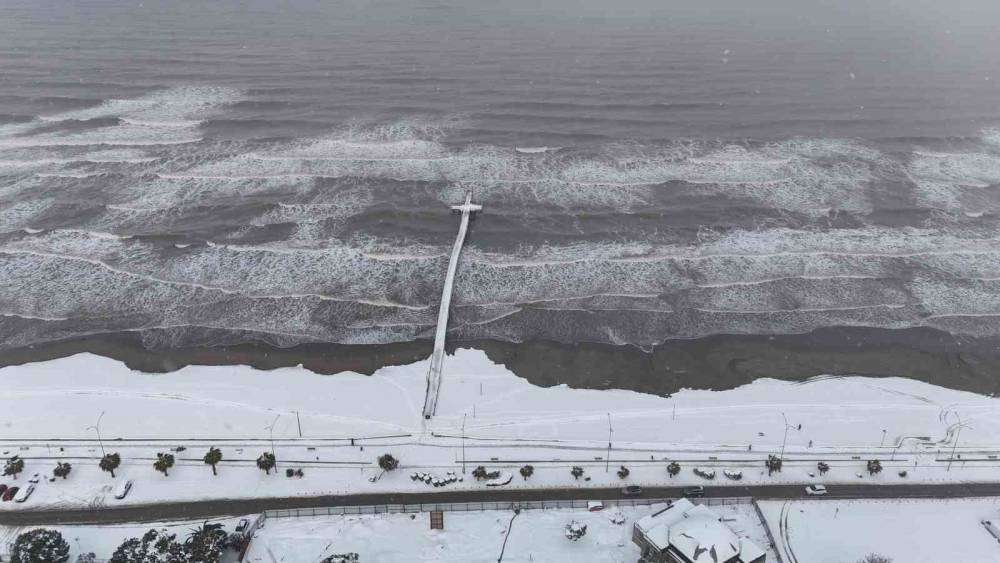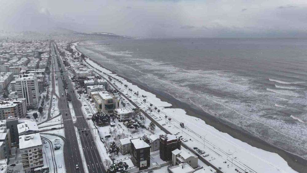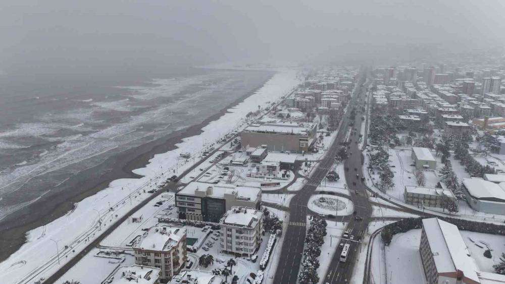 Samsun’un Atakum ilçesinde sahil ile karın seyri doyumsuz manzarası havadan görüntülendi. Kar yağışı ile birlikle kent sakinleri soluğu sahilde aldı.