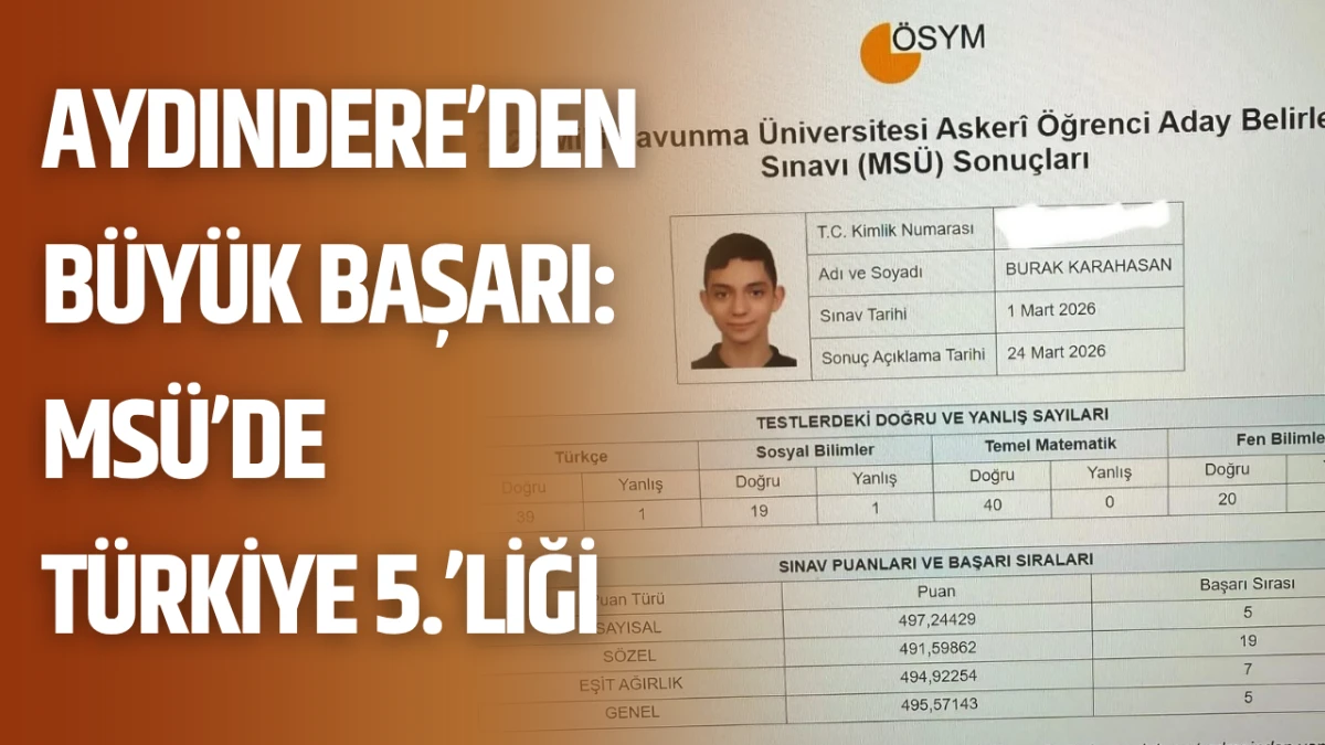 Disiplinli çalışması, azmi ve kararlılığıyla dikkat çeken Burak Karahasan’ın bu önemli başarısı, Aydındere’de büyük sevinçle karşılandı. Genç yaşta gösterdiği üstün performansla adından söz ettiren Karahasan, eğitim hayatındaki başarısını MSÜ sınavında da ortaya koydu.