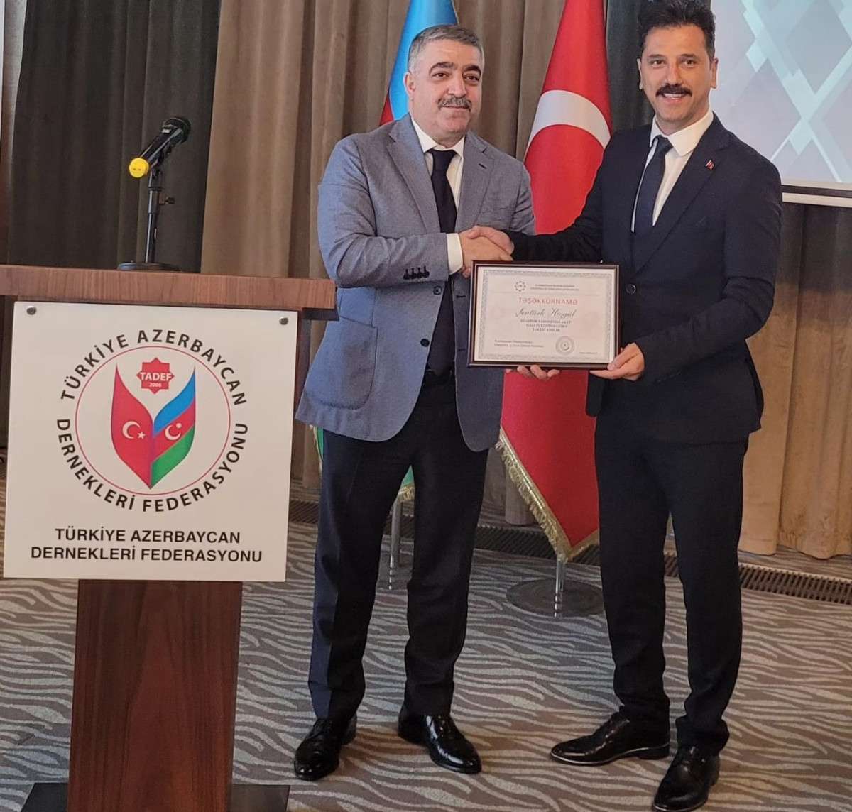 Manisa Azerbaycan Kültür ve Dayanışma Derneği Yönetim Kurulu Başkanı Şentürk Hoşgül, Azerbaycan Cumhuriyeti Diaspora Bakanı Fuad Muradov tarafından teşekkür belgesi ile taltif edildi.