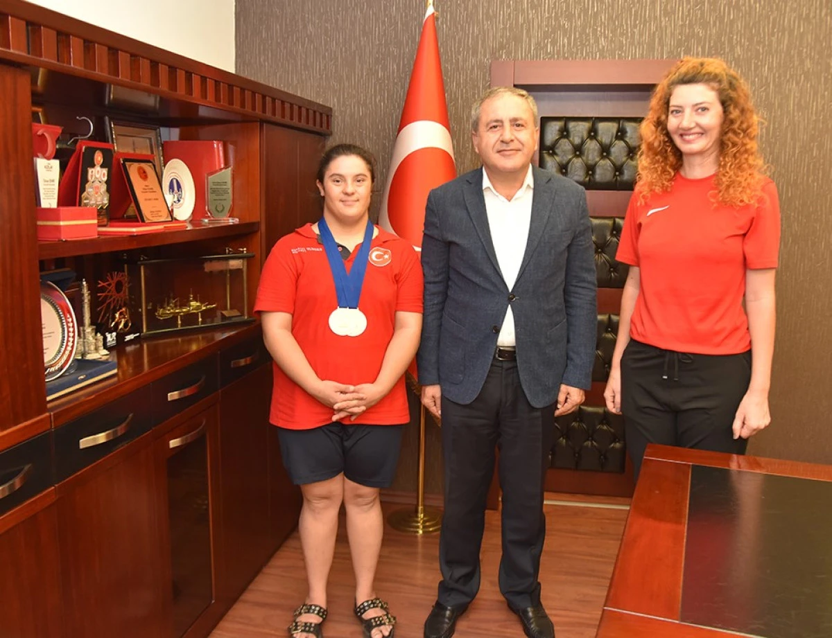 İzmir, Karşıyaka Kaymakamı Özkan Demir, Çekya'nın Prag kentinde düzenlenen Down Sendromlular Avrupa Şampiyonasında teniste şampiyon olan Kadriye Berfin Aşık,