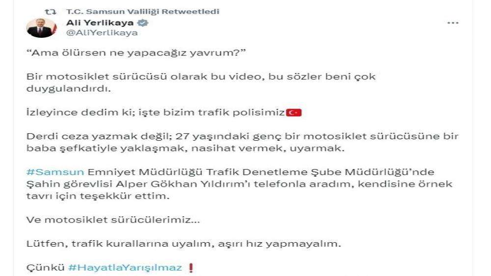 Bakan Yerlikaya sosyal medya hesabından “Ama ölürsen ne yapacağız yavrum?” başlığıyla yaptığı paylaşımda, “Bir motosiklet sürücüsü olarak bu video, bu sözler beni çok duygulandırdı. İzleyince dedim ki; işte bizim trafik polisimiz. Derdi ceza yazmak değil; 27 yaşındaki genç bir motosiklet sürücüsüne bir baba şefkatiyle yaklaşmak, nasihat vermek, uyarmak. Samsun Emniyet Müdürlüğü Trafik Denetleme Şube Müdürlüğünde şahin görevlisi Alper Gökhan Yıldırım’ı telefonla aradım, kendisine örnek tavrı için teşekkür ettim. Ve motosiklet sürücülerimiz. Lütfen, trafik kurallarına uyalım, aşırı hız yapmayalım” ifadelerini yer verdi.