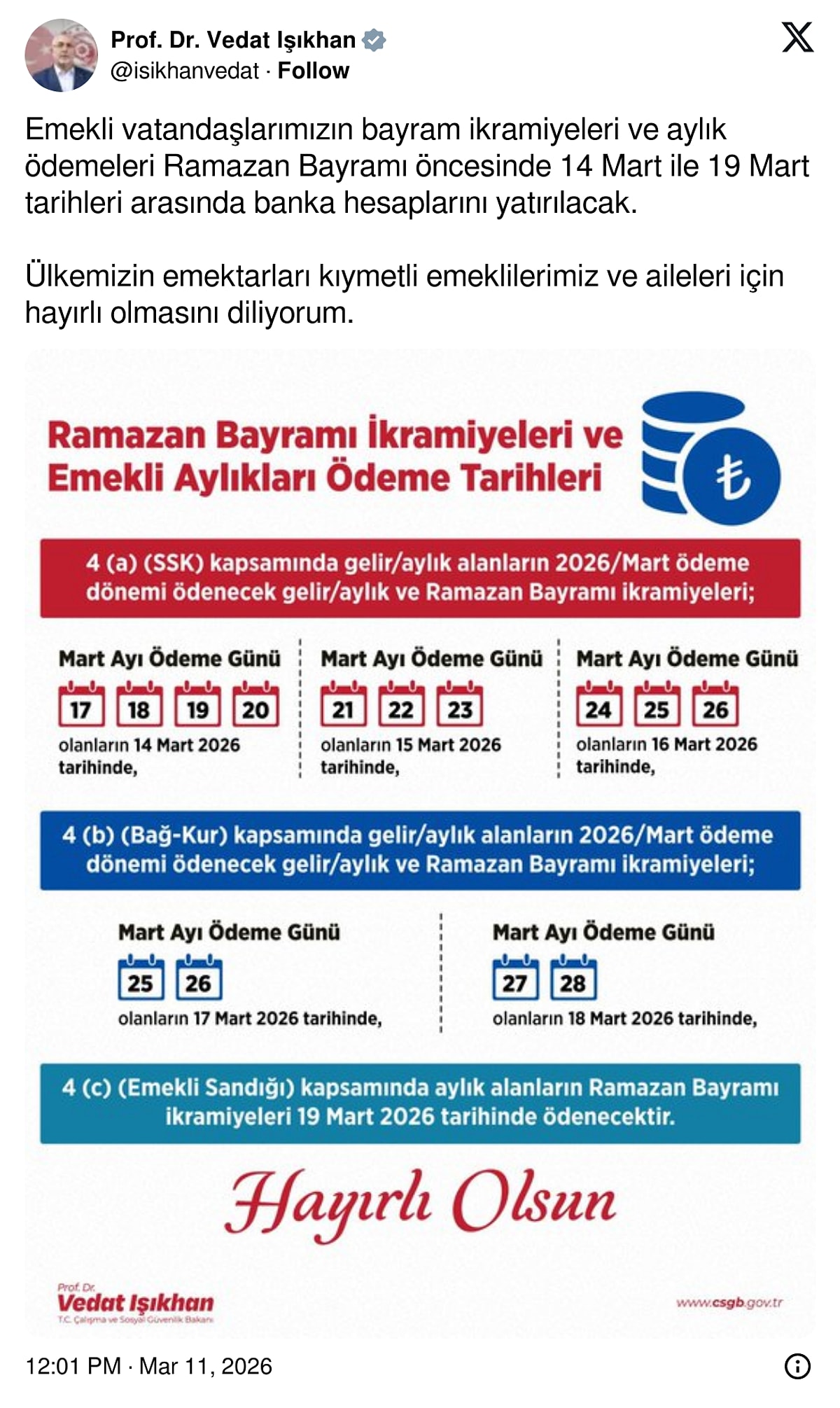 Bakanlık tarafından yapılan bilgilendirmeye göre, emekli vatandaşların bayram ikramiyeleri ile aylık maaş ödemeleri 14 Mart ile 19 Mart tarihleri arasında banka hesaplarına yatırılacak.