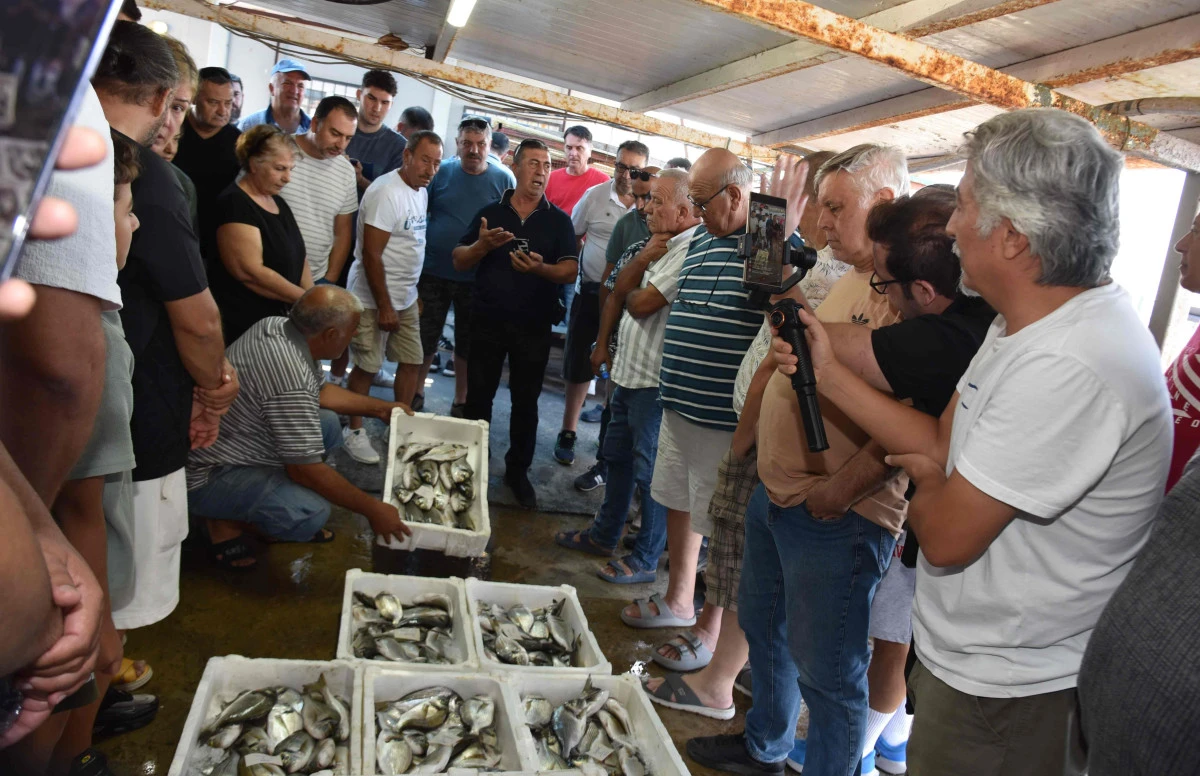 İzmir, Karşıyaka Şemikler balıkçılarının avladıkları balıklar meraklı bakışlarla mezatta kapışılıyor.