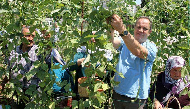 Başkan Kerim Aksu, mahalle sakini bayanlarla beraber Giresun yöresinde oldukça yüksek verimli olan halk arasında 'Fakir Fasulyesi' olarak bilinen fasulyelerden topladı.