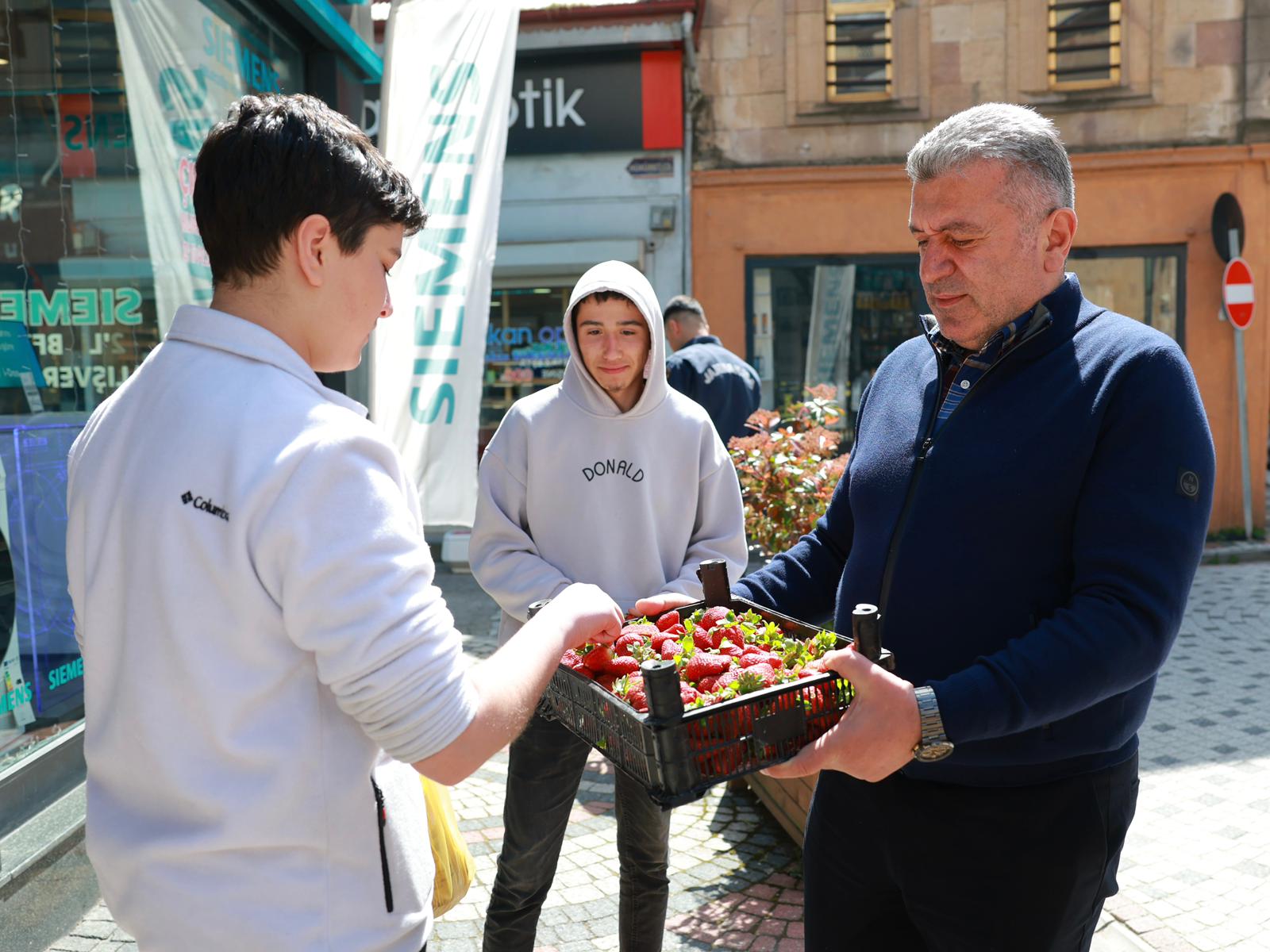 Başkan Sıbıç, bu kez farklı bir etkinliğe imza atarak Bulancak sokaklarında vatandaşlara çilek ikramında bulundu.