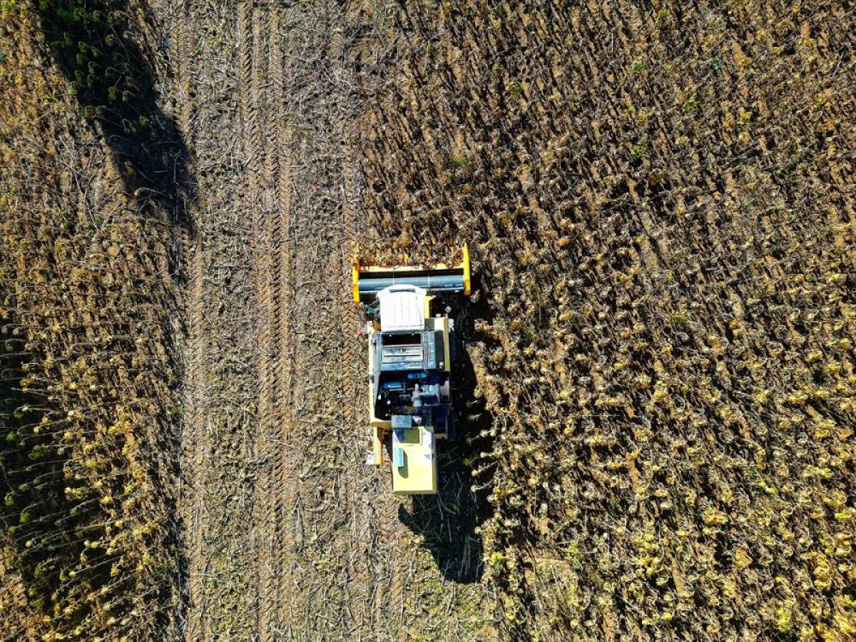 Boyu 2 metreyi bulan ayçiçeklerinin biçerdöverle hasat edilmesinin ardından çekirdekleri branda üzerinde kurutulmaya bırakılıyor.