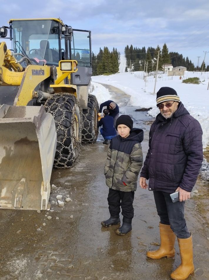 Karla mücadele ekiplerinin iş makineleriyle yaptığı hummalı çalışma sonucu yol güvenli hale getirilirken, karın keyfini çıkarmak isteyen vatandaşlar da kepçelerin ardından yolun açılmasını bekledi.