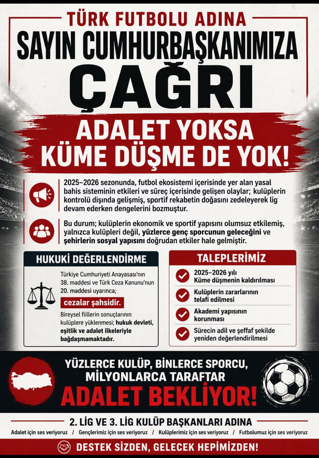 Bizler, emeğin ve rekabetin adil şartlarda korunmasını savunuyoruz. Cezaların şahsi olması gerektiğine inanıyor, bireysel hataların kulüplere ve camialara mal edilmesinin hukuk ve adalet ilkeleriyle bağdaşmadığını düşünüyoruz. Bu doğrultuda; Küme düşmenin kaldırılması, Kulüplerin uğradığı zararların telafi edilmesi, Akademi yapılarının korunması ve sürecin adil ve şeffaf şekilde yeniden değerlendirilmesi taleplerimizi kamuoyuna saygıyla duyuruyoruz. Yüzlerce kulüp, binlerce sporcu ve milyonlarca taraftar için adalet istiyoruz. Destek sizden, gelecek hepimizden!”