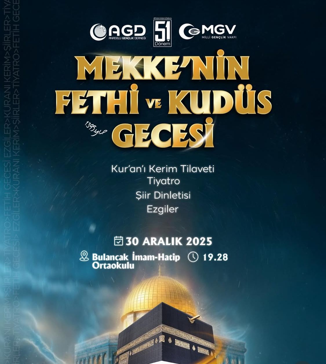 Program, 30 Aralık Salı günü saat 19.28’de, Bulancak İmam-Hatip Ortaokulu ev sahipliğinde yapılacak. Etkinlikte Mekke’nin fethinin tarihsel ve manevi önemi ele alınırken, Kudüs’ün İslam dünyasındaki yeri ve anlamı da çeşitli sunum ve anlatımlarla vurgulanacak.