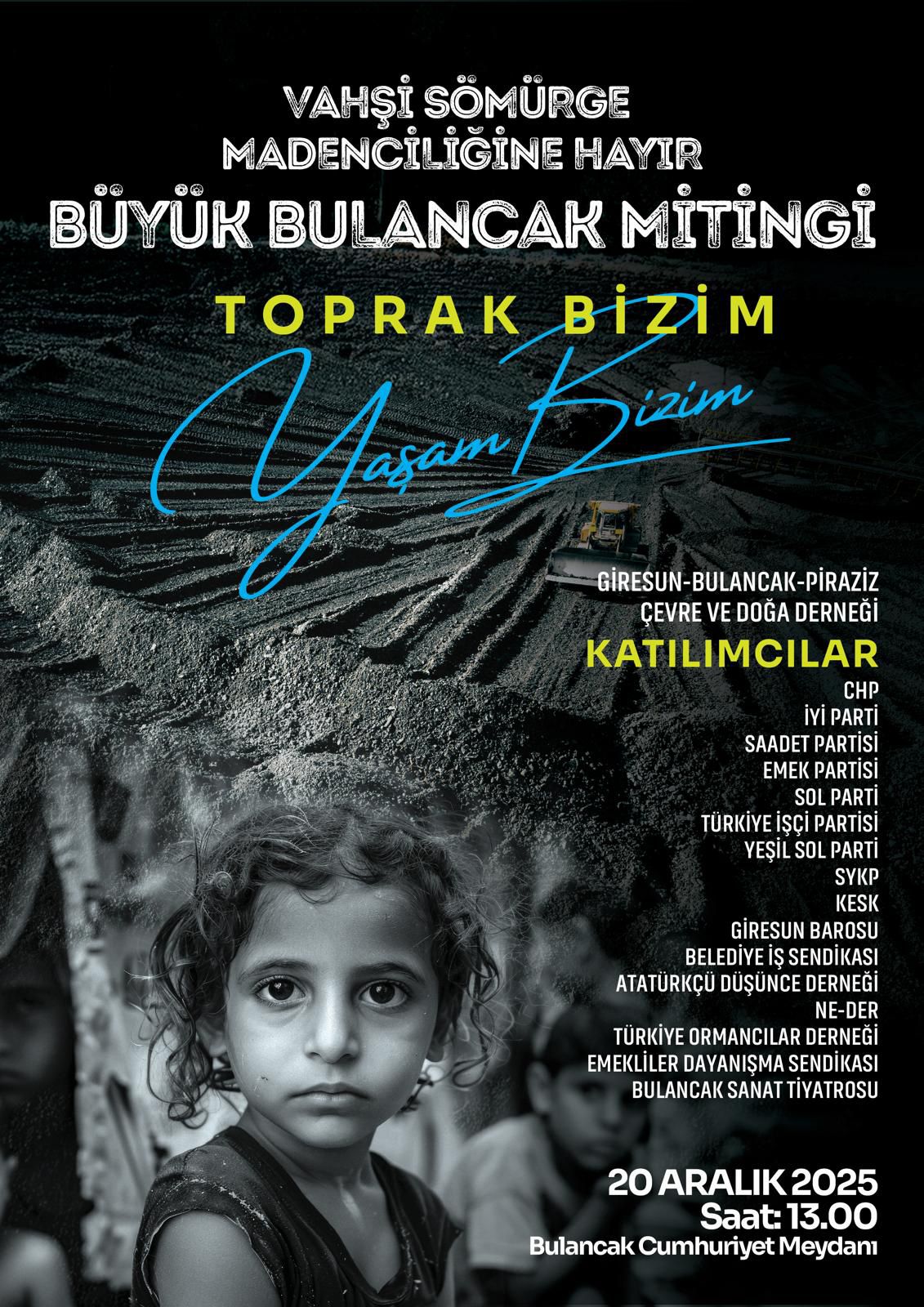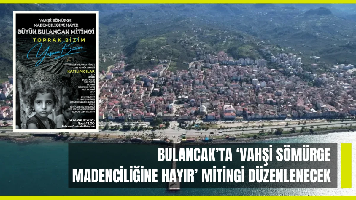 “ Vahşi Sömürge Madenciliğine Hayır – Toprak Bizim, Yaşam Bizim” sloganıyla gerçekleştirilecek olan Büyük Bulancak Mitingi, 20 Aralık 2025 Cumartesi günü yapılacak.