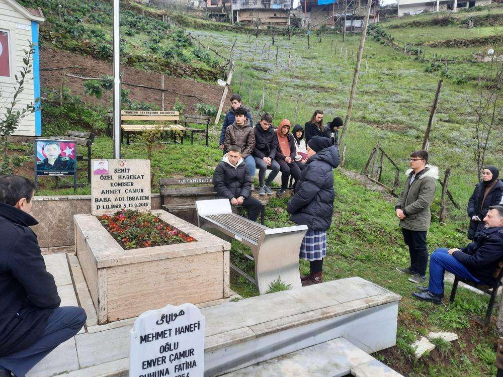 TRABZON (AA) - Trabzon'da bir grup lise öğrencisi, şehit Başkomiser Ahmet Çamur'un mezarını ziyaret etti.Çaykara Çok Programlı Anadolu Lisesi 12. sınıf öğrencileri, değerler eğitimi dersi kapsamında şehidin Soğanlı Mahallesi'ndeki mezarı başında bir araya geldi.Öğrencilerin milli ve manevi değerlerini benimsemeleri amacıyla gerçekleştirilen ziyarete, Okul Müdür Baş Yardımcısı Adnan Köse ,Okul Müdür Yardımcısı Zihni Boz ve Rehber Öğretmen Çiğdem Çakmak da katıldı.Öğrenciler, Hakkari Şemdinli'de 2015'te terör saldırısında şehit olan Başkomiser Ahmet Çamur'un mezarı başında dua etti.