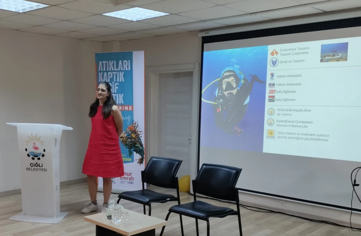 Belediyenin ev sahipliğinde düzenlenen “Atıkları Kaptık, Resif Yaptık” adlı seminerde, Endüstriyel tasarımcı ve proje yürütücüsü Nermin Sena Özger,