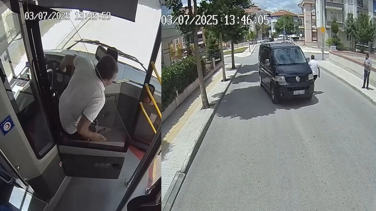Çorum'da bir halk otobüsü sürücüsünün, içinde sürücü bulunmayan ve caddede geri giden panelvanı durdurması, araç kamerasıyla kaydedildi.