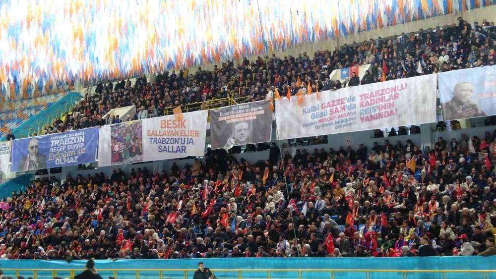 “Trabzon büyük şehir doyamadım tadına. Uzaktan sevmek olmaz, gel yakına yakına” cümleleri ile konuşmasına başlayan Cumhurbaşkanı Recep Tayyip Erdoğan, “Özü bir, sözü bir, gönlü bir Trabzon’da bizi tekrar buluşturan Rabbime hamdolsun” diyerek sürdürdü. Erdoğan’ın konuşması sırasında kürsüye çıkan bir partili kendisi ile öz çekim yaparken, ardından görevliler tarafından indirildi.