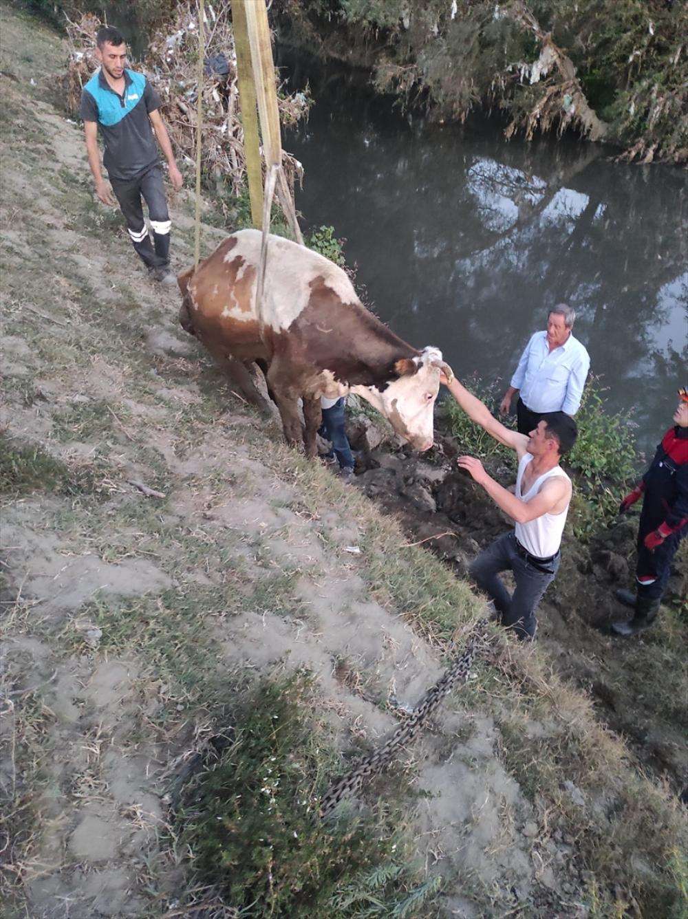 Bölgeye gelen itfaiye ekipleri, vinç yardımıyla kurtardıkları ineği sahibine teslim etti.