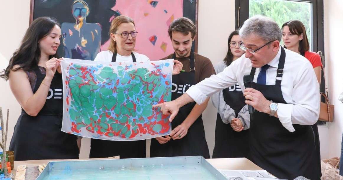 DESEM’de Eğitim Bilimleri Enstitüsü öğrencilerinin kurduğu ebru sanatı standını da ziyaret eden Rektör Yılmaz, burada ebru sanatı çalışmasını öğrencilerle birlikte gerçekleştirdi. Ebru sanatı çalışmasının hem kültürel entegrasyon hem de Türkiye’nin zengin sanat geleneğini tanıtma açısından öneminin altını çizen Rektör Yılmaz, DEÜ’deki sosyal olanaklara vurgu yaparak, öğrencileri bu imkanlardan yararlanmaya davet etti.
