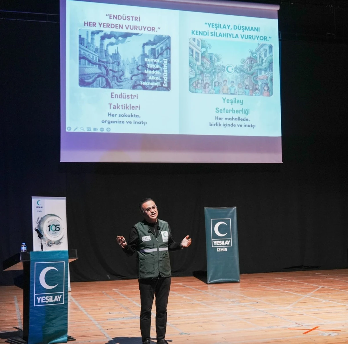 Dr. Yahşi, "Bağımlılık mücadelesinde kaybedilmiş her fert, vatan sathından koparılmış bir karış topraktır. Ülkemiz, en büyük gücünü genç nesillerden almıştır." Yeşilay kurucusu Ord. Prof. Dr. Mazhar Osman Uzman'ın bu konudaki vizyonunun altını çizen Yahşi, Yeşilay'ın 1934'te kamu yararına çalışan kurum olmasının Gazi Mustafa Kemal Atatürk tarafından onaylandığını belirtti. Ayrıca Dünya Sağlık Örgütü'nün kabul ettiği beş çeşit bağımlılıkla ilgili bilgi veren Yeşilay İzmir Şube Başkanı Dr. Ömer Yahşi, konuya ilişkin resmi verilerle birlikte Türkiye'nin bağımlılıkla ilgili durumuna da değinerek ve gerçek hayat hikayelerinden örnekler verdi.