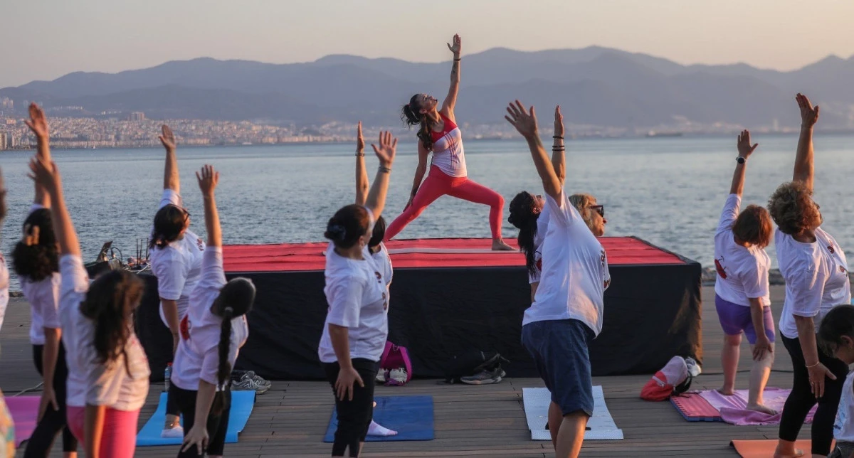 Dünya Yoga Günü'nde spor severler Bayraklı sahilinde bir araya geldi. Günbatımında gerçekleşen etkinliğe çevre ilçelerden de katılım yoğun oldu.