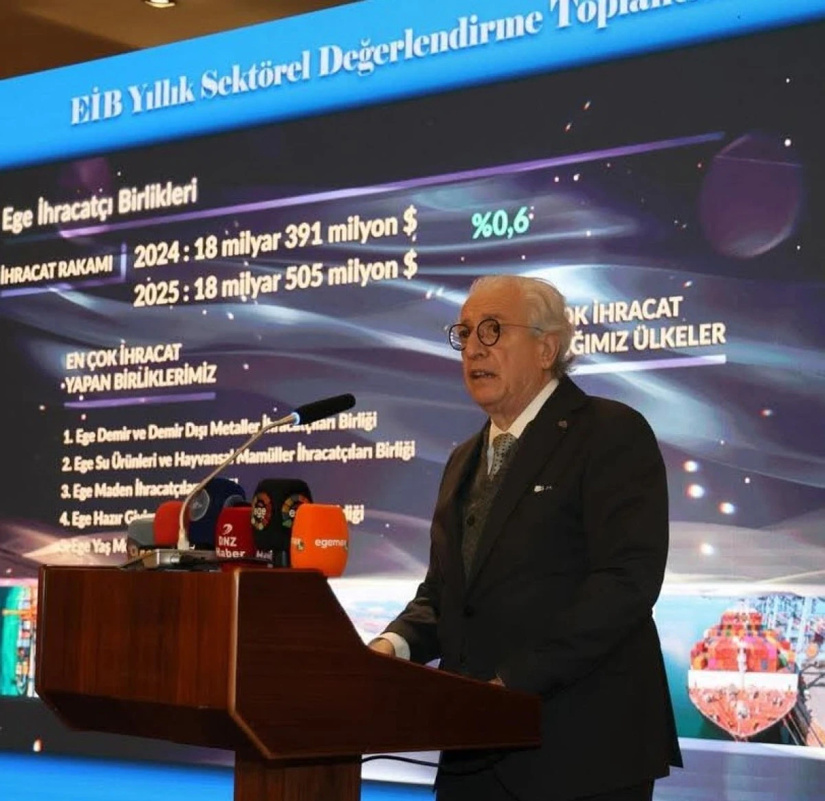 Ege İhracatçılar Birliği yıllık sektörel değerlendirme toplantısı, Koordinatör Başkanı Jak Eskinazi, EİB Koordinatör Başkan Yardımcısı ve Ege Demir ve Demirdışı Metaller İhracatçıları Birliği Başkanı Yalçın Ertan, Ege Yaş Meyve Sebze İhracatçıları Birliği Başkanı Hayrettin Uçak...
