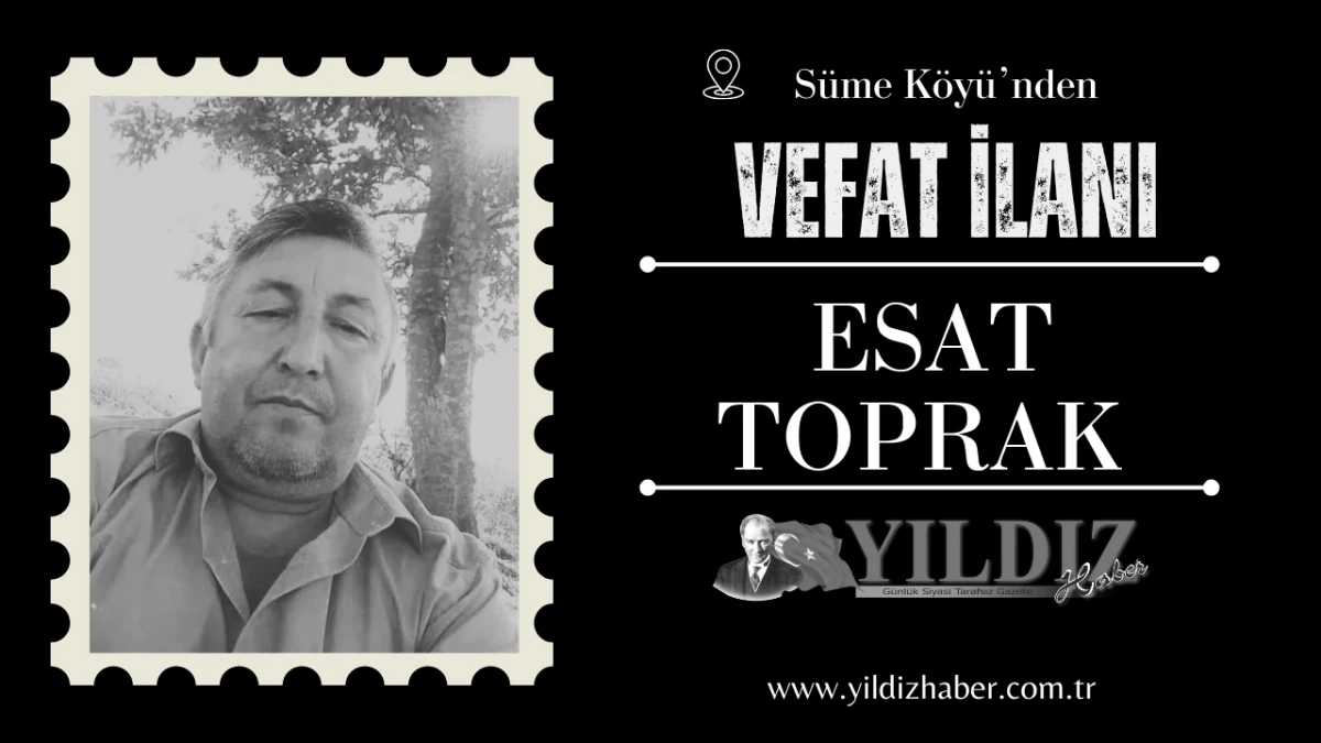 Süme Köyü'nden Traboğulları'ndan, merhum Ahmet Toprak'ın oğlu; Mehmet, Bahtiyar ve Arife'nin kardeşleri; İlknur, Işıl, Emine, Yeşim ve Tolga'nın babaları, Esat Toprak vefat etti. Cenazesi 24 Aralık 2025 Çarşamba (Bugün) Öğle namazına müteakip Erdoğan köyü İkisu camii'nde kılınacak cenaze namazından sonra aile kabristanlığında toprağa verilecek.