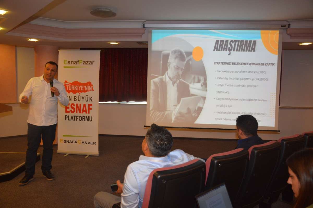 Oda başkanlarına sunum hazırlayan ESNAFACANVER E-ticaret A.Ş. Genel Müdürü Yaşar Yenikale, amaçlarının online ticaret konusunda esnaf sanatkarların önünü açmak ve online alışveriş siteleri ile çalışan esnafa yeni bir alternatif sunmak olduğunu söyledi. Yenikale, ‘Esnaf sanatkarları diğer sitelerin ağır komisyon yüklerinden kurtarmak için İESOB ile Esnafacanver e-ticaret A.Ş. tarafından önemli bir projeyi yürütüyoruz’ dedi.