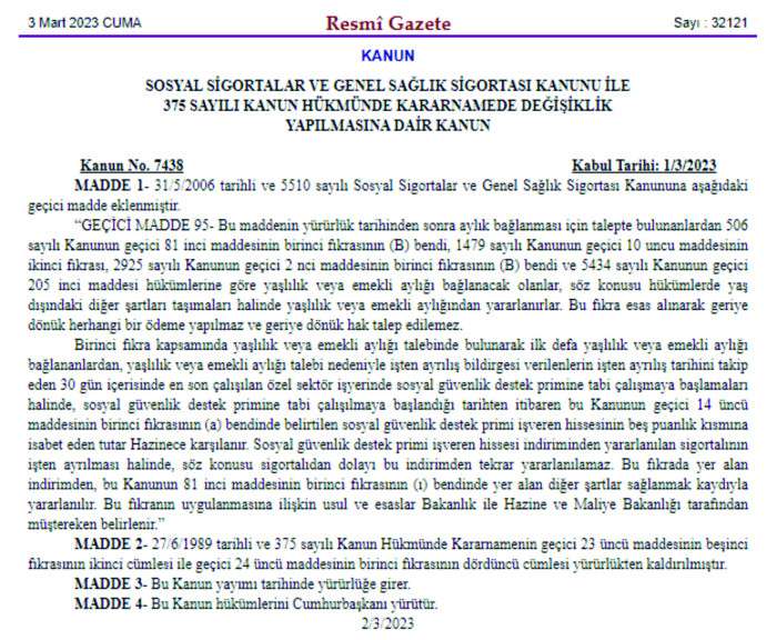 Kanundaki düzenleme ile Sosyal Sigortalar ve Genel Sağlık Sigortası Kanunu'na geçici madde eklenerek ilgili kanunlara göre kanunun yürürlük tarihinden sonra aylık bağlanması talebinde bulunanlardan yaşlılık veya emekli aylığı bağlanacak olanlar, söz konusu hükümlerde yaş dışındaki diğer şartları taşımaları halinde yaşlılık veya emekli aylığından yararlanacak.