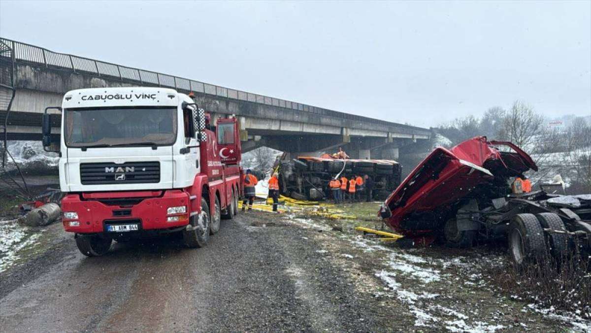 Anadolu Otoyolu'nun Düzce kesiminde meydana gelen kazada kar küreme aracıyla tırın köprüden devrilmesi sonucu 2 sürücü hayatını kaybetti.