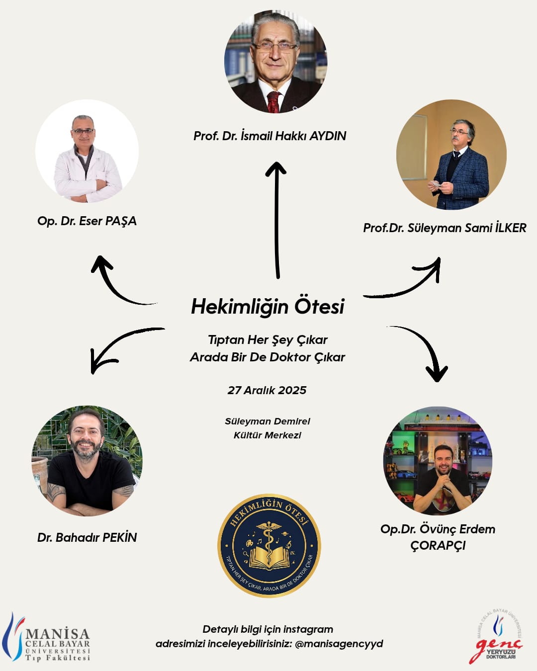 Manisa Celal Bayar Üniversitesi (MCBÜ) Genç Yeryüzü Doktorları Kulübü, dikkat çeken bir sempozyuma ev sahipliği yapmaya hazırlanıyor. 27 Aralık 2025 Cumartesi günü düzenlenecek olan “Hekimliğin Ötesi: Tıptan Her Şey Çıkar, Arada Bir de Doktor Çıkar” başlıklı sempozyum, Süleyman Demirel Kültür Merkezi’nde gerçekleştirilecek.