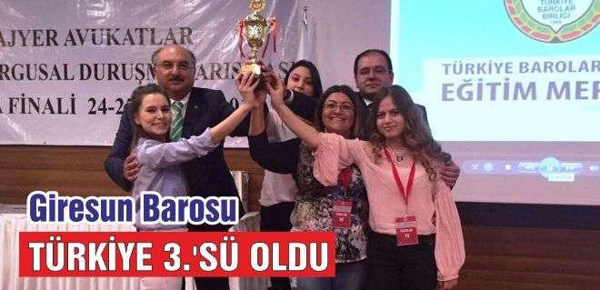 Karadeniz Bölgesi Şampiyonu olan Giresun Barosu, şampiyonada hem ilimizi hem de bölgemizi başarı ile temsil etti. Stajyer Av. Ayşe Yanıkoğlu, Stajyer Av. Aydan Küçük, Stajyer Av. Seda Safinaz Eker ve Stajyer Av. Fikriye Atar’dan oluşan Giresun Barosu takımı katıldığı turnuva sonucunda şampiyonluk kupasını Baro Başkanı Av. Gültekin Uzunalioğlu ile birlikte aldılar. Şampiyonada 1. Kars Barosu, 2. İstanbul Barosu 3. ise Giresun Barosu oldu. Giresun Barosu takımının çalıştırıcılığını Av. Ufuk Kılıç yaparken, Giresun Barosu takımı oluşturan Stajyer Avukat meslektaşlarına, takımı çalıştıran koç Av. Ufuk Kılıç'a ve takıma bilgi ve belge yardımında bulunan Stajyer Av. Başak Gül Uzunalioğlu'na teşekkür ettiler.