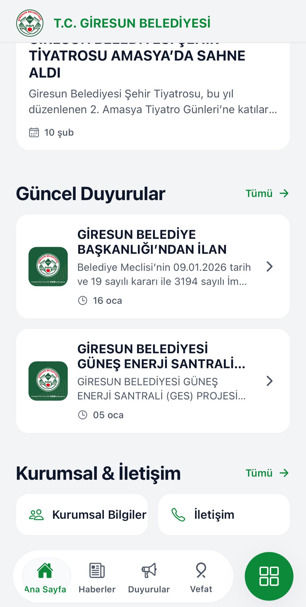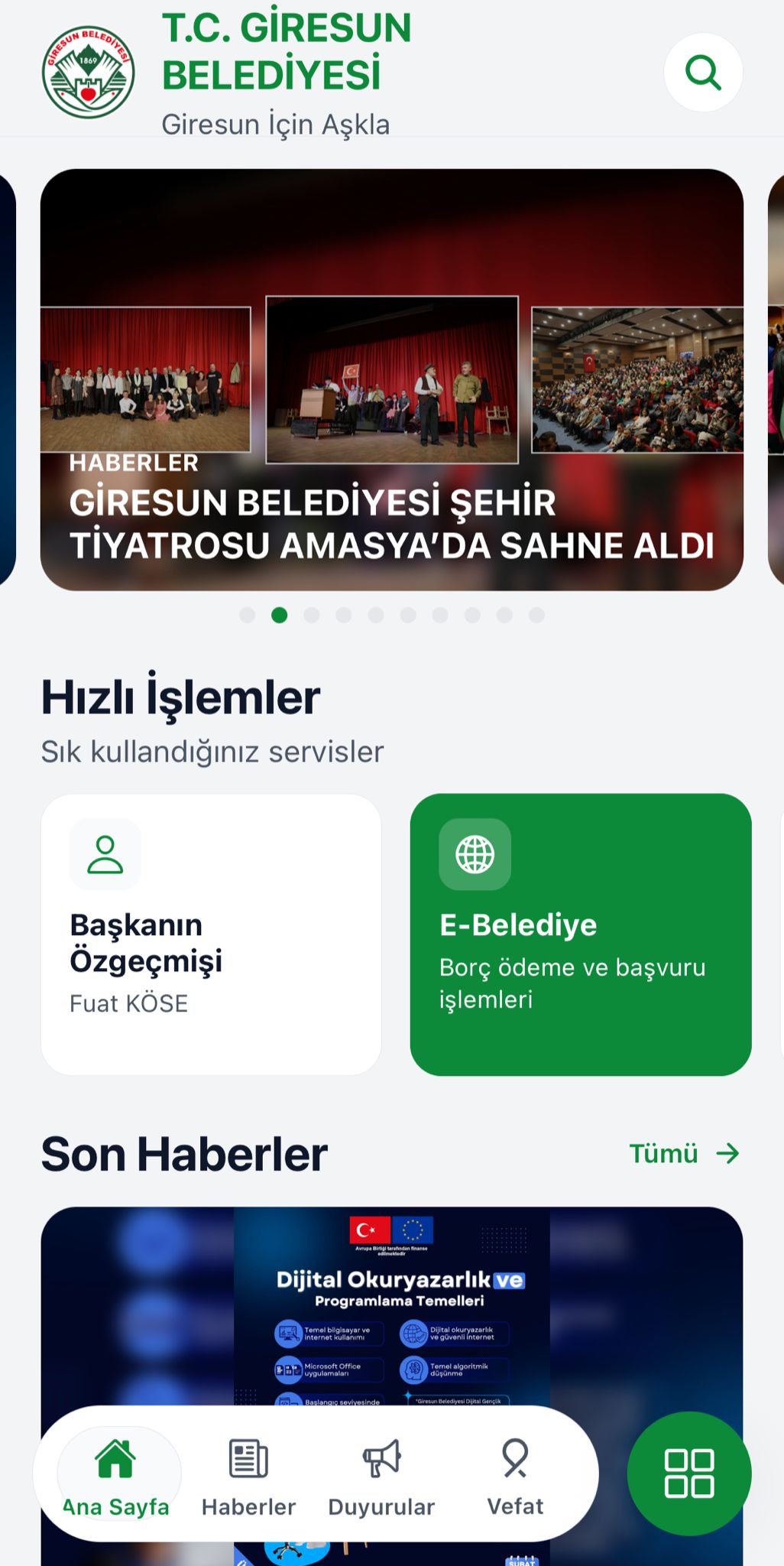 Giresun Belediyesi mobil uygulamasıyla vatandaşlar, şehirle ilgili güncel gelişmelere anında ulaşabilecek. Uygulama üzerinden belediyenin sunduğu hizmetler kolayca takip edilirken, etkinlikler ve duyurular da anlık bildirimlerle kullanıcılara iletilecek.