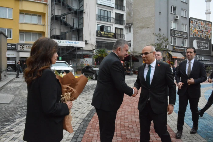 Karşılama sırasında Vali Mustafa Koç’a çiçek takdim edilirken, Vali Koç çiçeği alarak kendisini karşılayan heyetle tek tek selamlaştı.